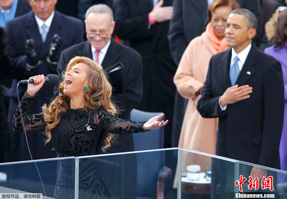 1月21日,美国连任总统奥巴马在华盛顿国会山举行公开宣誓就职仪式。 图为碧昂丝献唱。