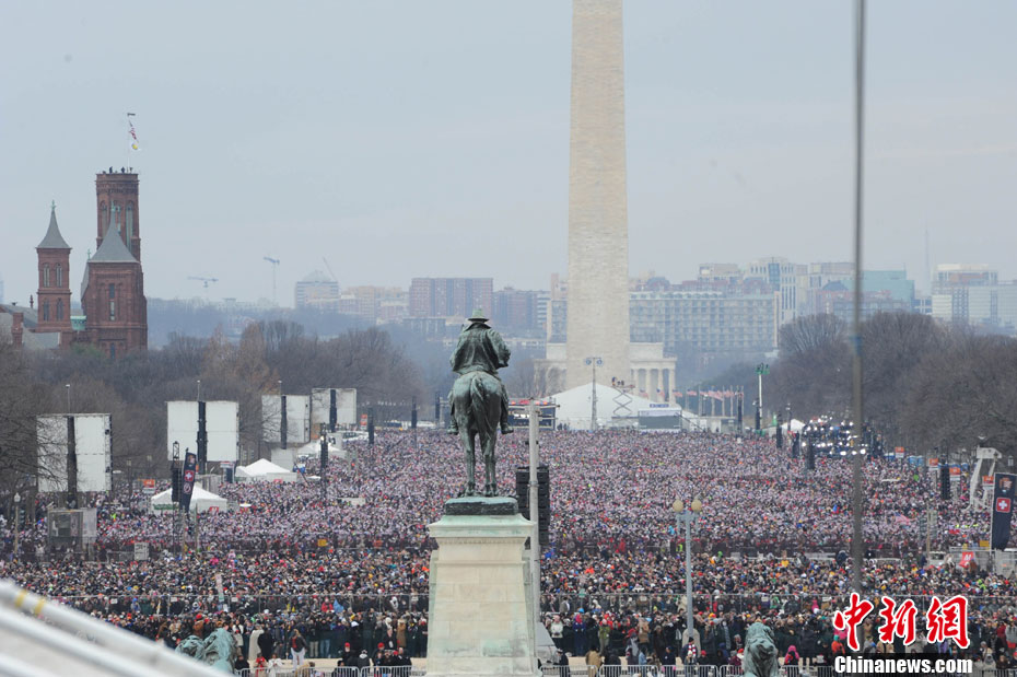 面对数十万热情的观众,美国2012年大选当选总统奥巴马21日在美国国会山宣誓就任美国第44任第57届总统。 图为当日约60至80万美国人到场观看就职典礼,将华盛顿国家广场挤得水泄不通。中新社发 吴庆才 摄