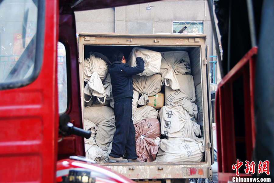 1月21日,贵州省威宁自治县邮政局的工作人员在处理堆积如山的快递包裹。随着中国春节的临近,为了避开实体店购物的拥挤和繁琐,越来越多的人选择网络购置年货,国内快递行业也随之迎来了“春运”高峰。此后的一段时间内,全国各家快递公司的快递员派送快件数量将大幅增加,部分快递公司增加人员及时处理快递包裹,确保尽快准确送到客户手中。中新社发 秦风 摄 图片来源:CNSPHOTO