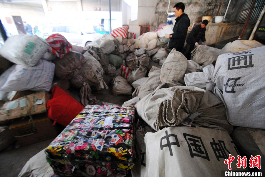 1月21日,贵州省威宁自治县邮政局的工作人员在处理堆积如山的快递包裹。随着中国春节的临近,为了避开实体店购物的拥挤和繁琐,越来越多的人选择网络购置年货,国内快递行业也随之迎来了“春运”高峰。此后的一段时间内,全国各家快递公司的快递员派送快件数量将大幅增加,部分快递公司增加人员及时处理快递包裹,确保尽快准确送到客户手中。中新社发 秦风 摄 图片来源:CNSPHOTO