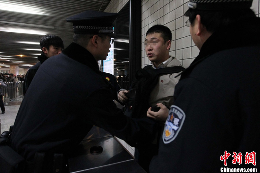 1月22日,针对岁末年初路网逃票行为有所回升的现象,上海地铁在原有车站逃票稽查的基础上,加大力度,开展逃票稽查专项整治行动。图为1月22日,上海,不愿意安检的乘客被警察拦下。图片来源:东方IC 版权作品 请勿转载