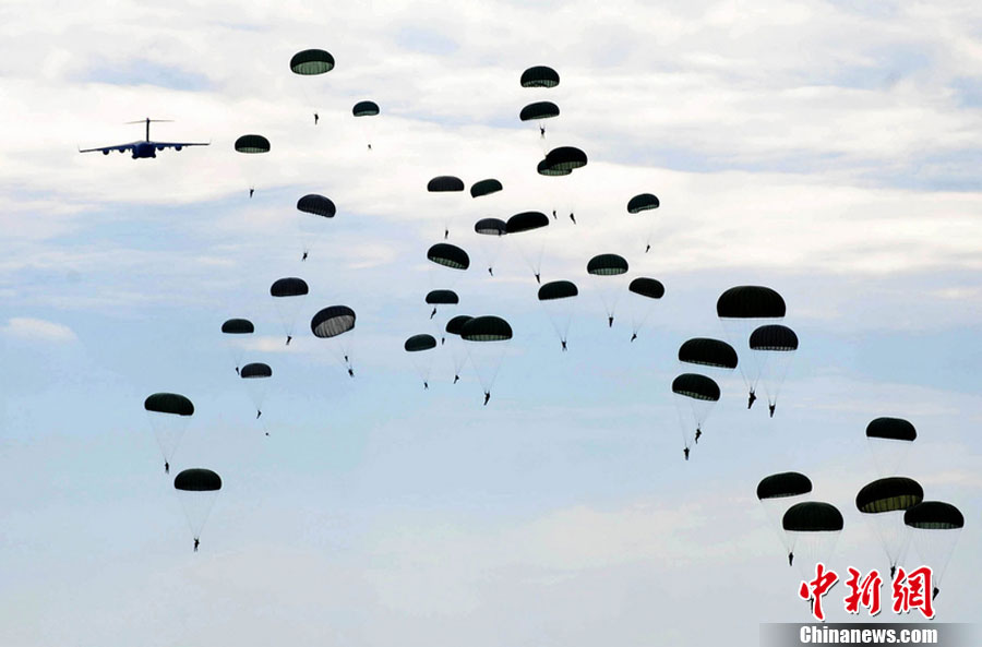2012美国空军年度震撼摄影图片公布。由美国空军摄影师拍摄并挑选。图为美国Fort Bragg,一架C-17 Globemaster III飞机把士兵“扔下来”。图片来源:东方IC 版权作品 请勿转载