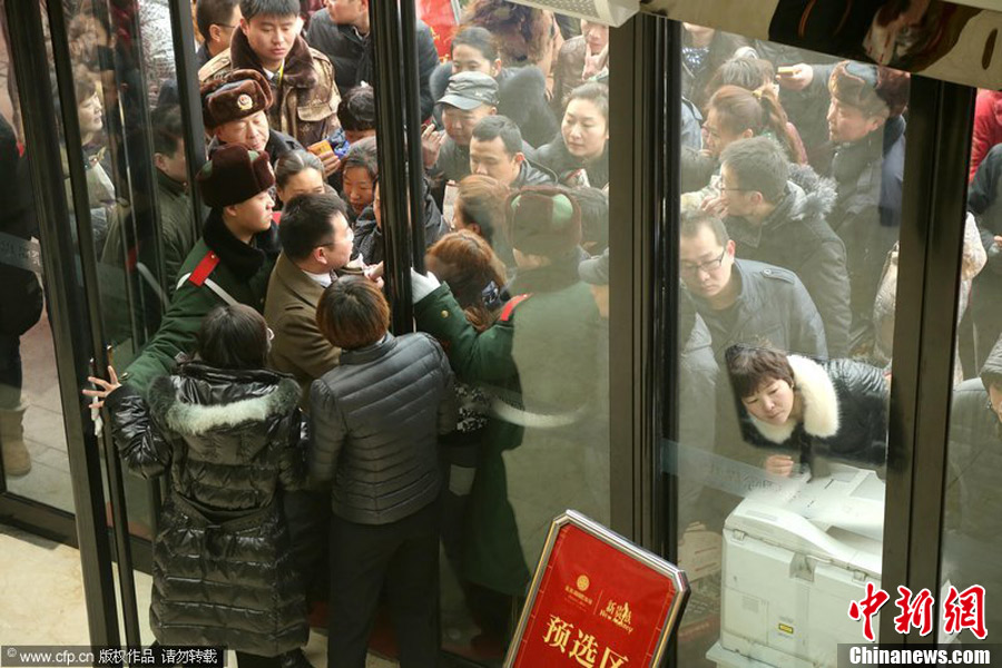 1月26日,河南省焦作市一楼盘开盘销售,吸引了众多购房者前来排号选房。上午9时开始选房后,近千名购房者上演了一场惊心动魄的“抢房”大战,现场秩序一度失控,房地产公司出动多名保安才维持住现场秩序。仅仅一个多小时,104套住房宣告售罄。图为众多购房者焦急的等待着进入预选区选房。唐玉磊 摄 图片来源:CFP视觉中国