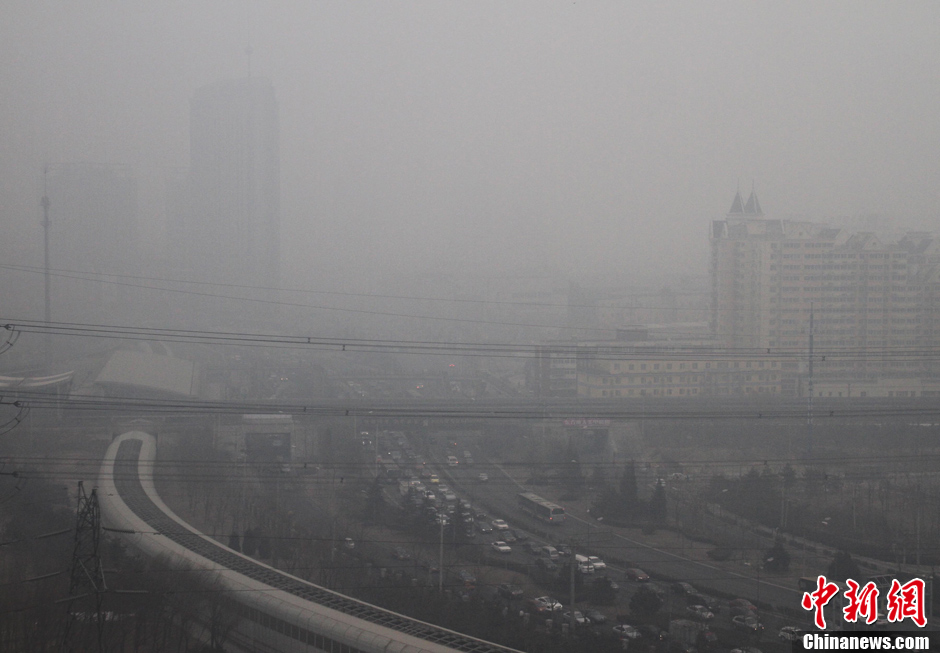 1月28日,北京依旧雾霾弥漫,能见度和空气质量较差,气象部门提示:有关部门和单位按照职责做好防雾准备工作;机场、高速公路等单位加强交通管理,保障安全;驾驶人员注意雾的变化,小心驾驶;建议尽量减少外出或做适当防护;户外活动注意安全。中新社发 吴芒子 摄