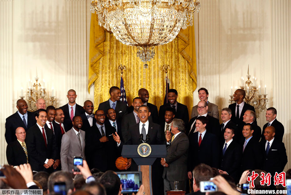 奥巴马白宫接见热火队员 获赠球衣喜笑颜开