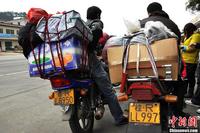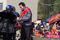 1月30日,接近5000架次摩托车经广东封开县进入广西返乡过年。随着春节的临近,预计“铁骑大军”返乡高潮将于下周出现。为了让返乡之路更温暖更安全,封开县工会、团委等部门联合开展“暖流行动”,在长岗收费站免费为驾驶摩托返乡的民工们提供警车护送过境、热姜粥和热开水、简便的医疗服务、打电话给家人报平安、摩托车维修服务等12类免费服务,让‘暖流“温暖每一颗归家的心。为韦石明 摄 图片来源:东方IC 版权作品 请勿转载