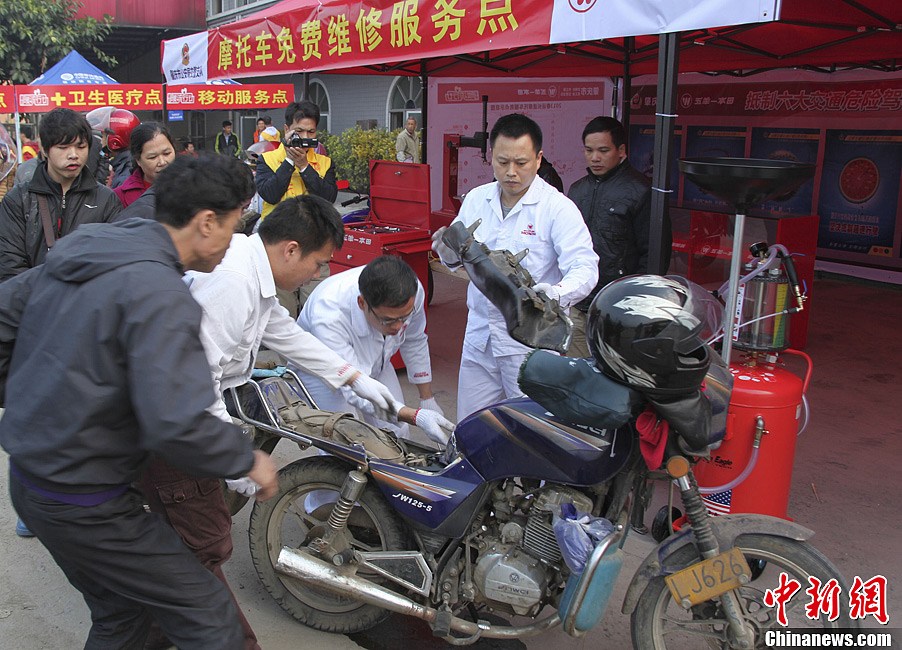 1月30日,广东广宁启动春运“暖流行动”,该县交警和超过百人的志愿者贴心服务途经当地回家过年的“铁流客”,为千里奔袭的过客送上热姜粥,免费为他们检测摩托车。图为志愿者在免费修理客人的铁骑。中新社发 黄耀辉 摄