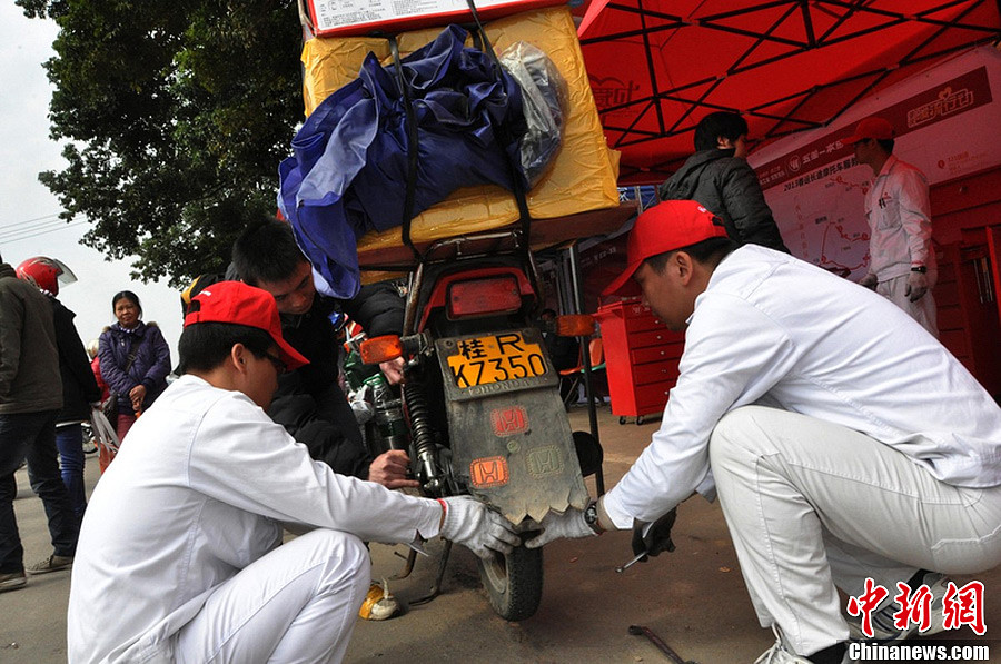 1月30日,接近5000架次摩托车经广东封开县进入广西返乡过年。随着春节的临近,预计“铁骑大军”返乡高潮将于下周出现。为了让返乡之路更温暖更安全,封开县工会、团委等部门联合开展“暖流行动”,在长岗收费站免费为驾驶摩托返乡的民工们提供警车护送过境、热姜粥和热开水、简便的医疗服务、打电话给家人报平安、摩托车维修服务等12类免费服务,让‘暖流“温暖每一颗归家的心。为韦石明 摄 图片来源:东方IC 版权作品 请勿转载