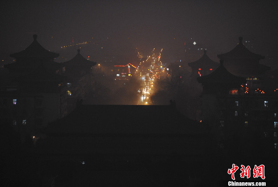 严重雾霾1月30日依然笼罩着北京,夜色中的空气质量仍为严重污染。图为昏暗的京城中轴线。中新社发 贾国荣 摄