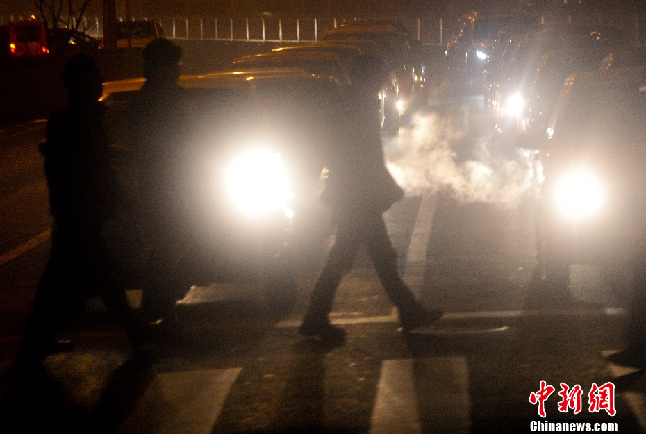 严重雾霾1月30日依然笼罩着北京,夜色中的空气质量仍为严重污染。图为满城道路出现汽车尾气大肆虐。中新社发 贾国荣 摄