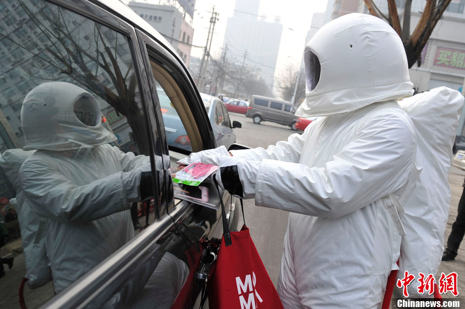 1月31日,山西太原街头,四名装扮成“太空人”的男子向民众发放PM2.5口罩。近一段时间,中国中东部地区持续雾霾天气,空气质量再次成为中国国内民众关注的焦点。韦亮 摄