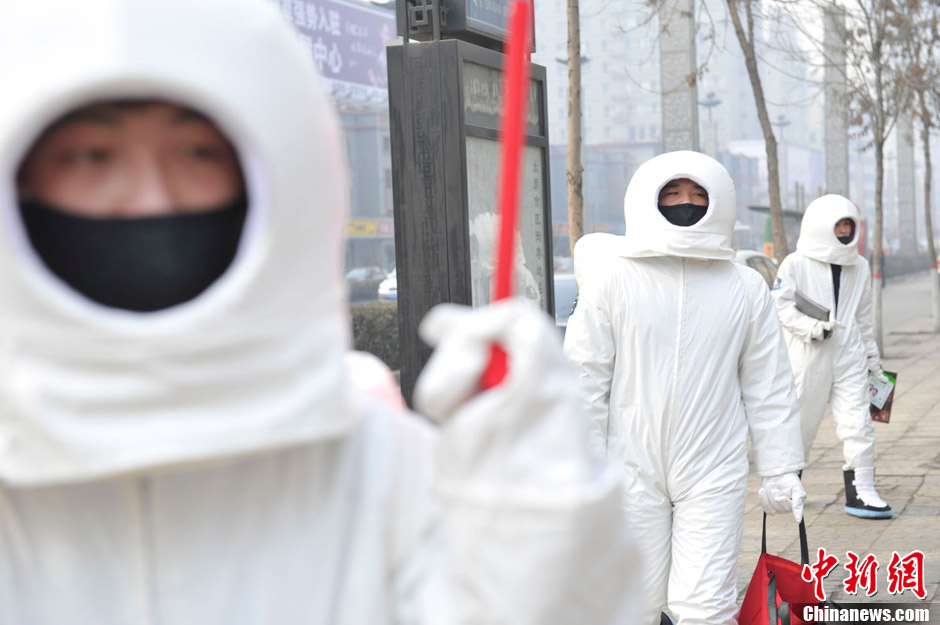 1月31日,山西太原街头,四名装扮成“太空人”的男子向民众发放PM2.5口罩。近一段时间,中国中东部地区持续雾霾天气,空气质量再次成为中国国内民众关注的焦点。韦亮 摄