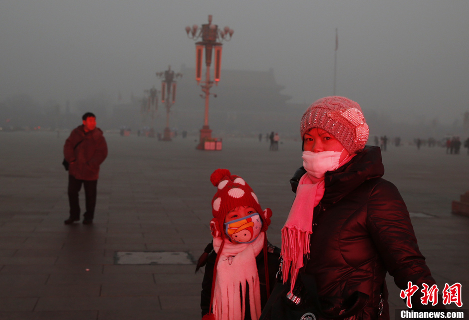 1月31日清晨,北京降水相态多样,雨夹雪、雪、冻雨同时存在,新年以来第四次“雾霾压城”持续至第五日。受冷空气影响,当日北京大部分地区的空气质量指数转为重度污染级别,2月1日有望连跳二三级,达到优良级别。图为游客在雾气重重的北京天安门广场游玩。中新社发 刘关关 摄