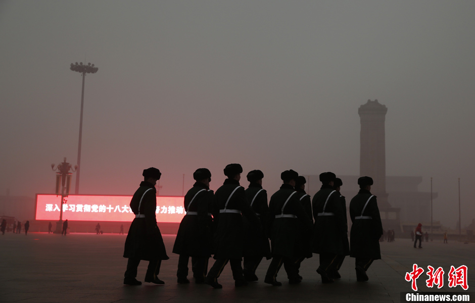 1月31日清晨,北京降水相态多样,雨夹雪、雪、冻雨同时存在,新年以来第四次“雾霾压城”持续至第五日。受冷空气影响,当日北京大部分地区的空气质量指数转为重度污染级别,2月1日有望连跳二三级,达到优良级别。图为北京天安门广场笼罩在一片雾蒙蒙中。中新社发 刘关关 摄