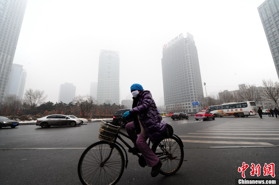 1月31日,沈阳市受大雾入侵,城市能见度较低,严重影响市民的出行。图为市民在浓雾中出行。中新社发 于海洋 摄