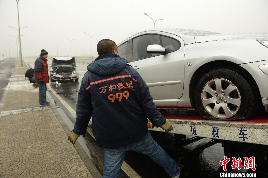 1月31日,雨雪凝冻天气使北京的交通受到影响,给市民出行带来不便。连接望京和太阳宫的阜通东大街出现多辆汽车追尾的事故。图为救援车辆正将受损汽车拖离现场。中新社发 侯宇 摄