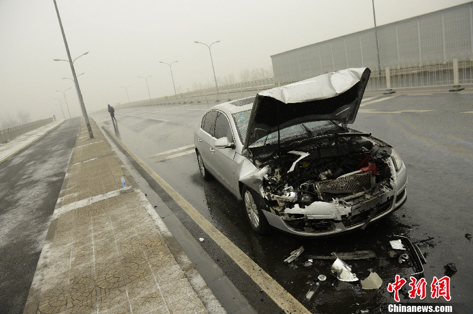 1月31日,雨雪凝冻天气使北京的交通受到影响,给市民出行带来不便。连接望京和太阳宫的阜通东大街出现多车追尾的事故。图为一辆受损的汽车还停留在现场。中新社发 侯宇 摄