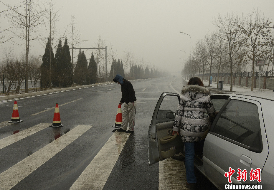 1月31日,雨雪凝冻天气使北京的交通受到影响,给市民出行带来不便。图为连接望京和太阳宫的阜通东大街一度暂时封闭,一名欲驾车回家的市民被挡在封锁线外。中新社发 侯宇 摄