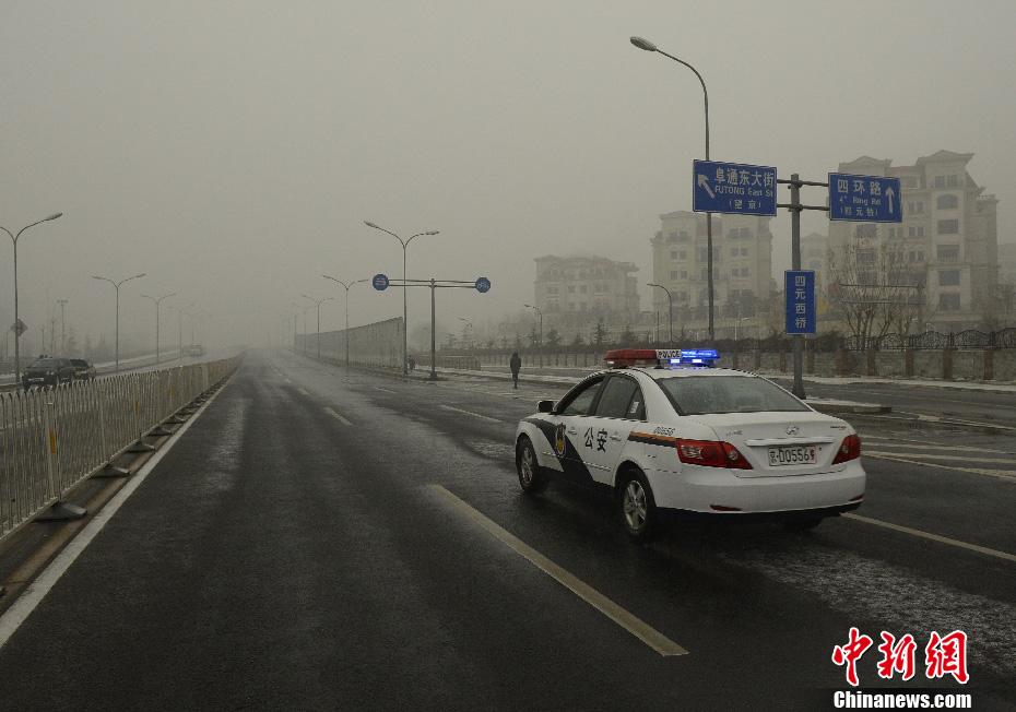 1月31日,雨雪凝冻天气使北京的交通受到影响,给市民出行带来不便。图为连接望京和太阳宫的阜通东大街一度暂时封闭,警察驾车检查路况。中新社发 侯宇 摄