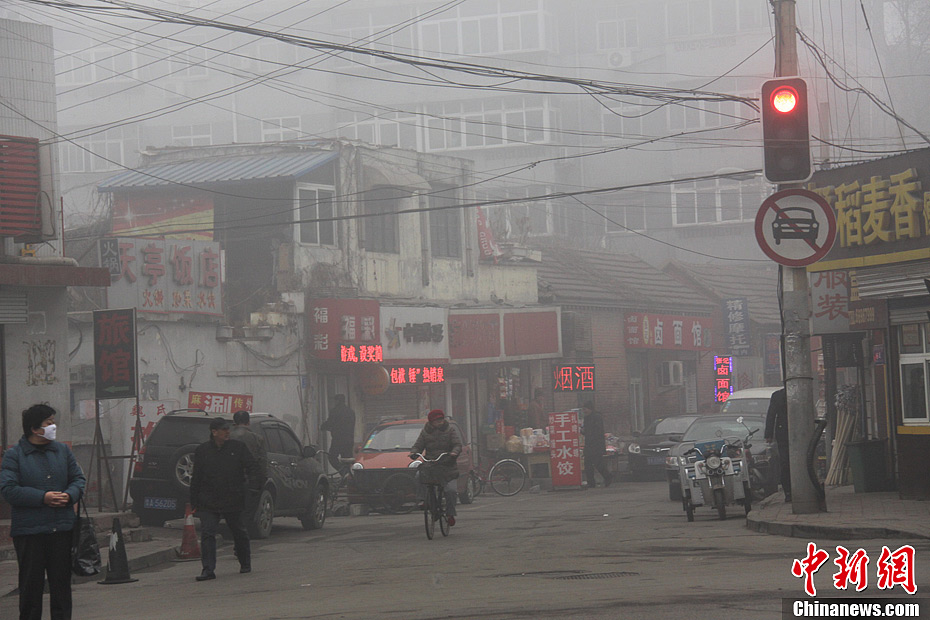 1月31日,山东省会济南再度遭受重霾侵袭,空气污染度严重超标。图为中午时分,济南一些小街的商铺挂灯营业。胡洪林 摄