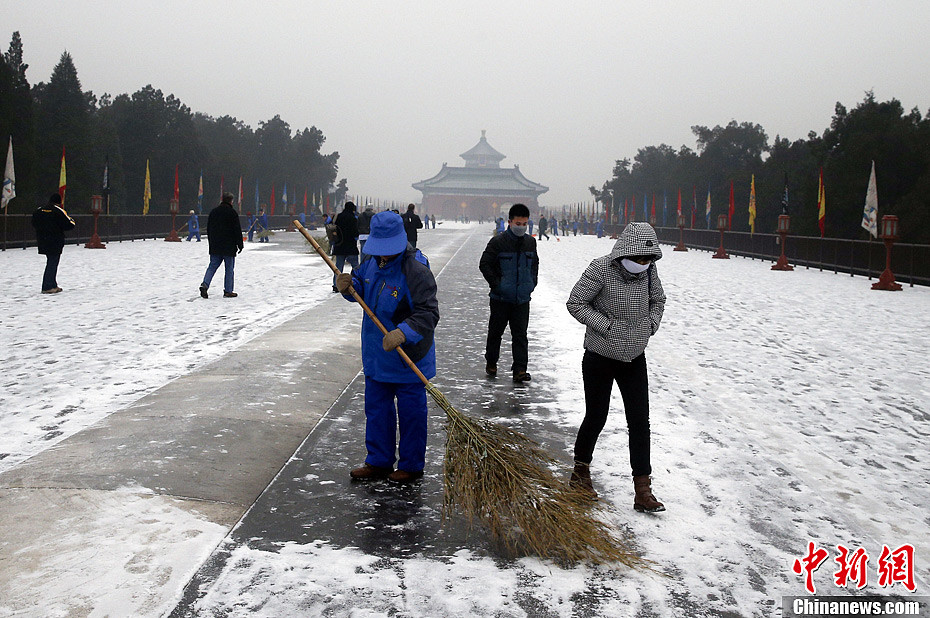 1月31日,两位戴着口罩的游客走在北京天坛公园里,一位工作人员正在扫雪。当日北京降下小雪,但降雪量不大,对缓解雾霾天气作用不明显,雾霾的彻底消散要等到后半夜北风来临后才有希望。中新社发 张浩 摄