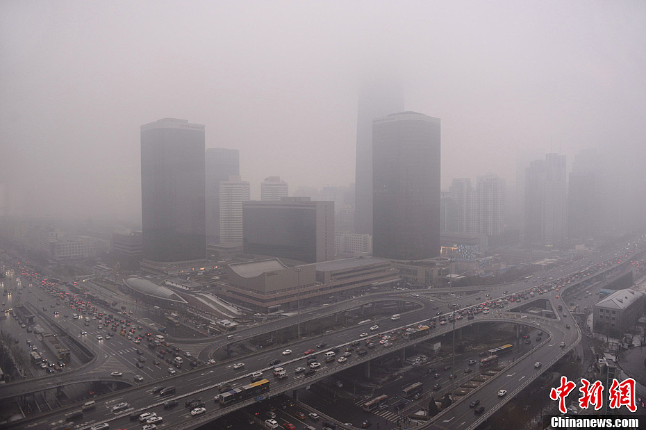 1月31日,北京迎来雨夹雪天气,同时新年以来第四次“雾霾压城”持续至第五日。冷空气的到来并没有使雾霾天气和空气质量有明显好转。许多高层建筑物顶端“深藏”在浓雾中,十分飘渺宛入云端。图为1月31日下午,北京国贸CBD,高楼笼罩在浓雾中。中新社发 李学仕 摄