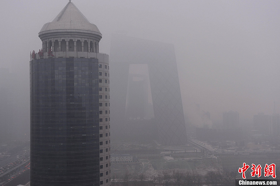 1月31日,北京迎来雨夹雪天气,同时新年以来第四次“雾霾压城”持续至第五日。冷空气的到来并没有使雾霾天气和空气质量有明显好转。许多高层建筑物顶端“深藏”在浓雾中,十分飘渺宛入云端。图为1月31日下午,北京国贸CBD,高楼笼罩在浓雾中。中新社发 李学仕 摄