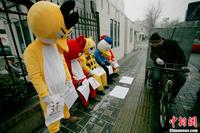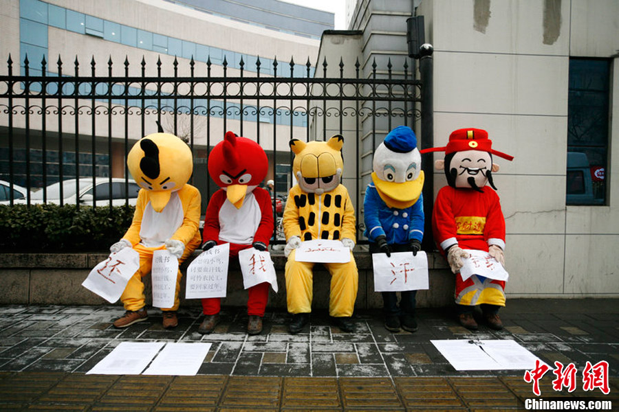 1月31日,北京,“愤怒的小鸟”、“加菲猫”、“唐老鸭”和“财神爷”等5个不同的卡通人物汇聚在中央人民广播电台外,以静坐的方式讨薪,希望得到社会关注。王王 摄 图片来源:CFP视觉中国