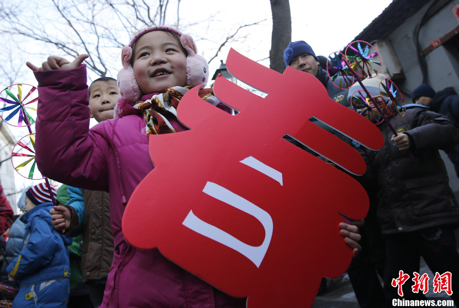 2月1日,是立春前三天,北京市东四八条胡同举行“春官春吏”报春活动,两名报春者,以鼓乐仪仗队相伴,沿街高喊“春来了”,向大家报告立春节气的到来,为社区居民送上春天的祝福。图为一名小女孩一边“报春”一边算着自己的年龄已经六岁了。中新社发 杜洋 摄