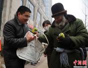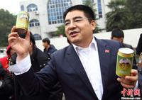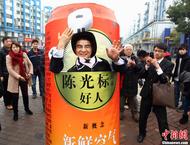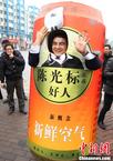 2月1日上午,陈光标钻进“易拉罐”走上南京街头,为销售自家生产的空气亲自“站台”,卖力吆喝着“台湾空气”和“井冈山空气”,自称“新鲜空气现在很畅销”,“三个月前这些空气还不大好卖,但三个月后竟然还供不应求了”。虽然此举引来围观,但在这个环境严重污染、雾霾困扰的时候,通过看似有些夸张、叫卖新鲜空气的方式宣传环保理念,引来现场不少路人的共鸣。中新社发 泱波 摄