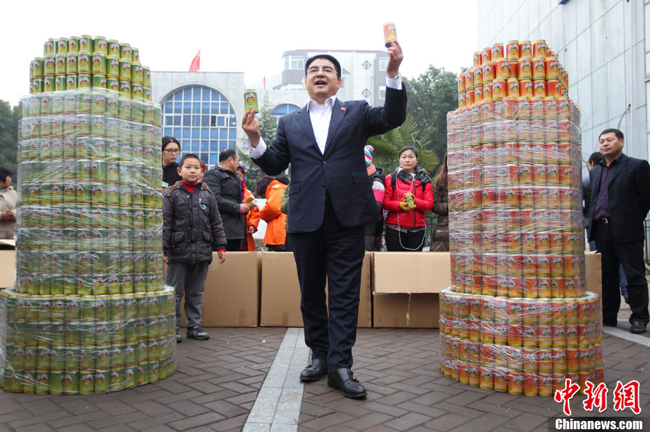 2月1日上午,陈光标钻进“易拉罐”走上南京街头,为销售自家生产的空气亲自“站台”,卖力吆喝着“台湾空气”和“井冈山空气”,自称“新鲜空气现在很畅销”,“三个月前这些空气还不大好卖,但三个月后竟然还供不应求了”。虽然此举引来围观,但在这个环境严重污染、雾霾困扰的时候,通过看似有些夸张、叫卖新鲜空气的方式宣传环保理念,引来现场不少路人的共鸣。中新社发 泱波 摄