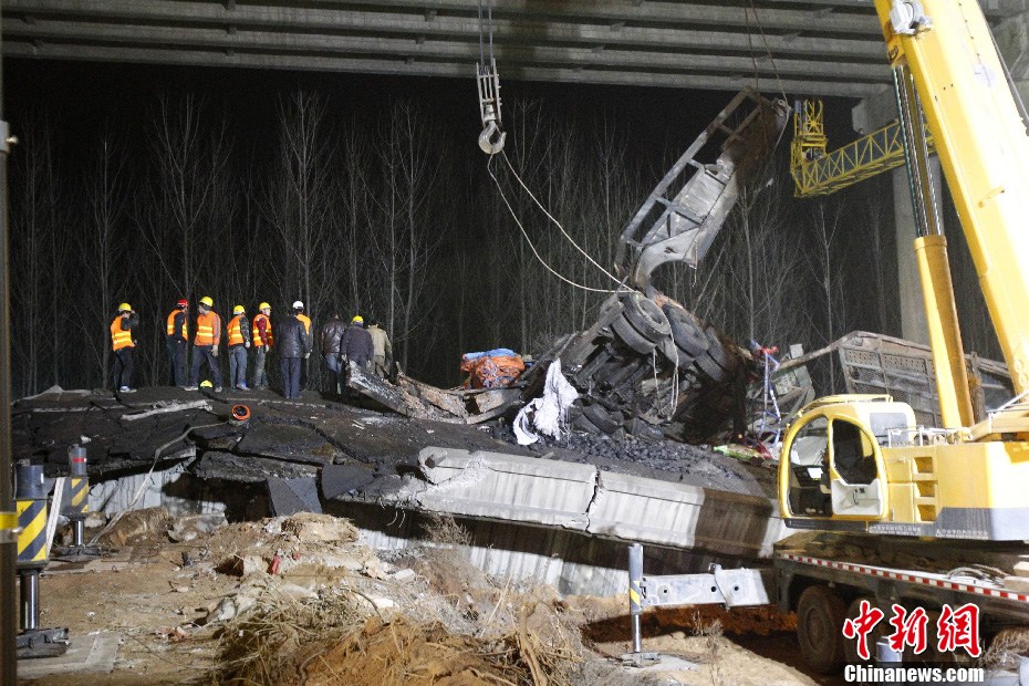 2月1日晚,河南高速大桥坍塌现场,连夜展开救援。2月1日上午9时许,连霍高速洛三段南半幅741+900M处义昌大桥发生垮塌事故,坍塌桥面长80M,致使9人死亡,11人正在医院进行救治,伤员中重伤4人,轻伤7人。中新社发 王中举 摄
