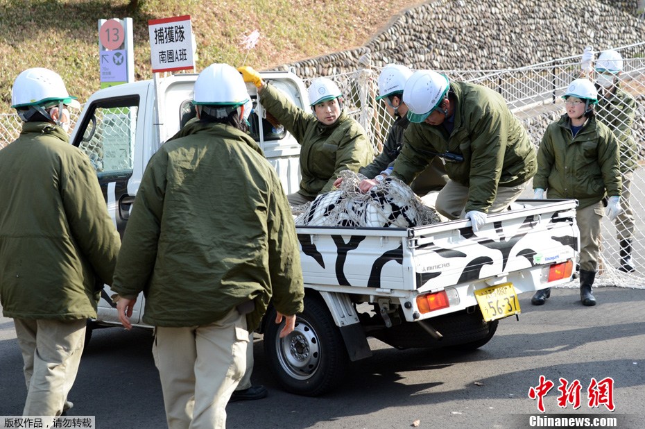 2月1日,在日本东京西郊多摩动物园举行的演习中,一名工作人员装扮成的“斑马”被麻醉枪“击中”后,工作人员用网将其困住。当天,多摩动物园举行了一年一度的应对动物逃跑演习。