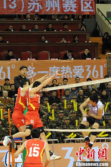 2月2日16时,中国男子排球联赛(2012-2013)决赛第二回合较量移师到苏州市体育中心体育馆进行。背水一战的北京来势汹汹,整场进攻十分凶猛,以25:26、25:20、29:27连胜三局获胜,扳回一局。本届男排联赛冠军鹿死谁手,悬念留到了3日的最终回争夺战。图为八一队球员双人拦网。王思哲 摄