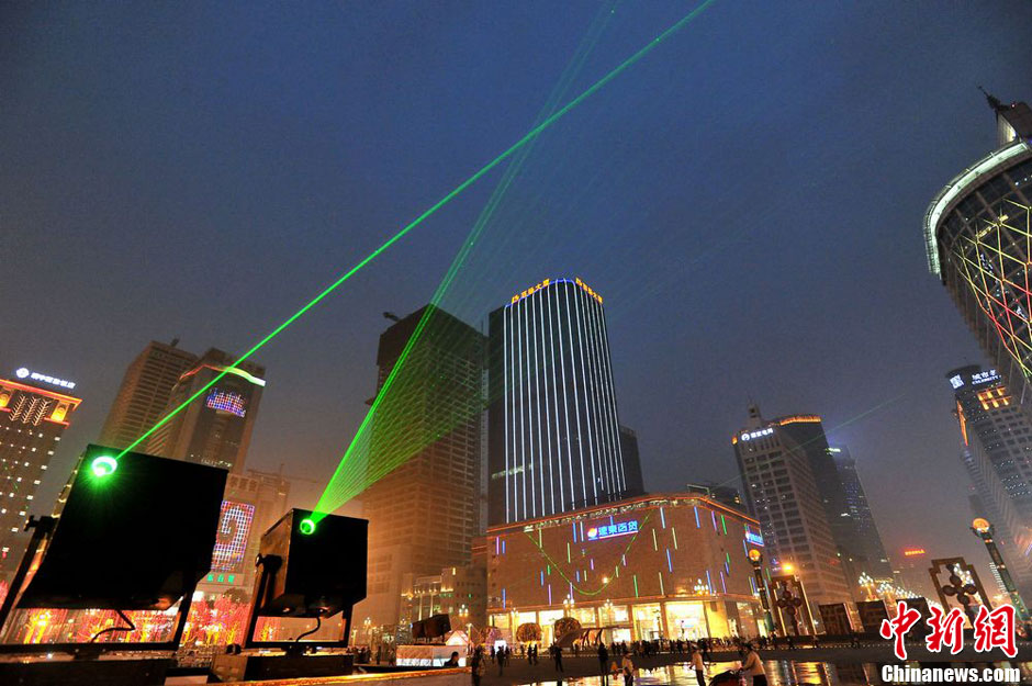 四川成都天府广场“激光秀” 与城市夜景相映生辉