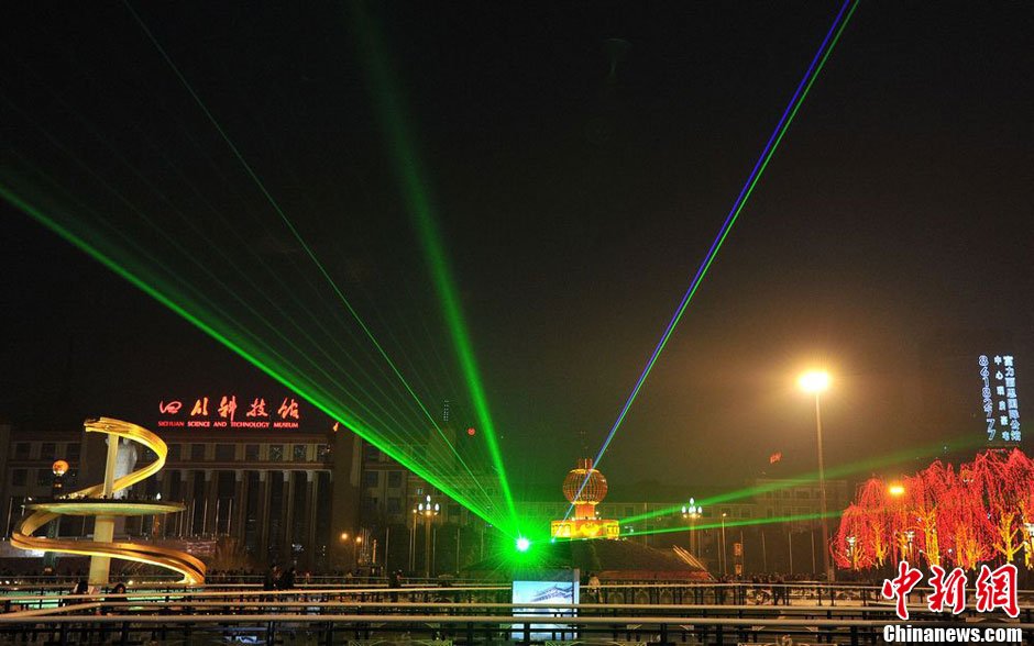 四川成都天府广场“激光秀” 与城市夜景相映生辉