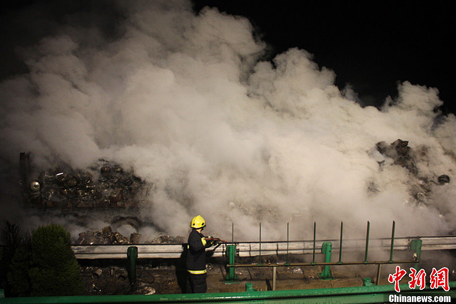 2月2日深夜23:30分左右,在G40沪陕高速合六叶段发生一起五车追尾并爆炸起火事故,事故造成1人死亡,4人受伤,事故造成合肥至六安段全线封堵,滞留大量春运旅客和客货车辆。直至3日6时30分左右,曾一度中断8个小时的事故路段逐步恢复畅通。图为事故现场。中新社发 张娅子 摄