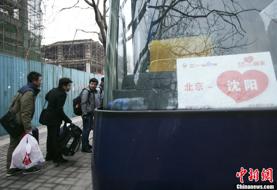 2月5日,在北京朝阳区复星国际中心门前,8辆橙色大巴载着320名“北漂”开往西安、合肥、郑州和沈阳,为帮助更多买票难的网友顺利回家,由一些企业发起“橙色大巴送老乡回家”活动,只要是在北京工作的异乡人,而且橙色大巴路线刚好符合,就可免费乘坐,工作人员还为旅客准备了方便面矿泉水等食品。中新社发 杜洋 摄