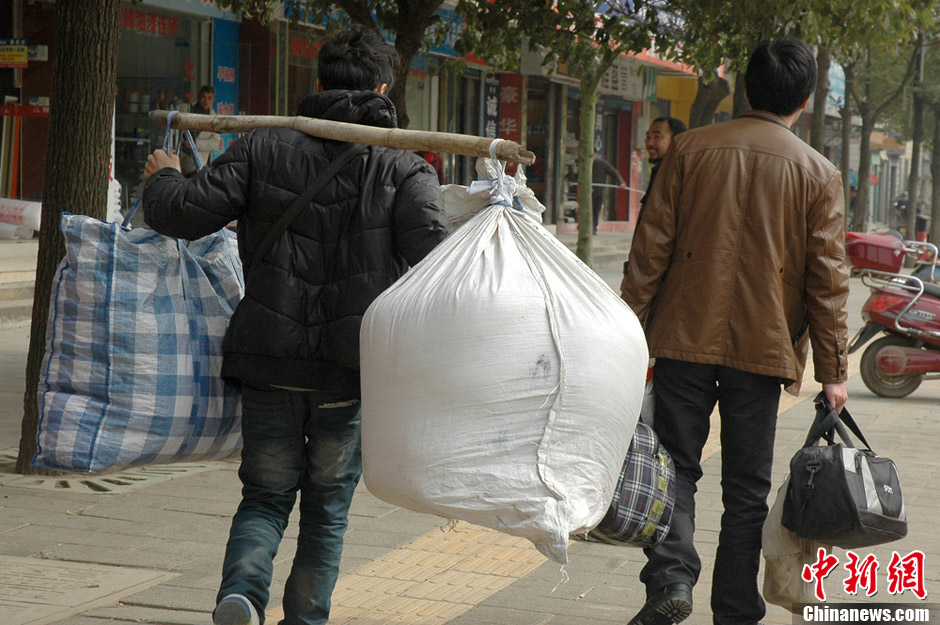 过年了,是回家团聚团圆的传统节日。湖南省安仁县外出打工的近10万农民工陆续回家过春节。走进城乡到处可见一道“包”织成的风景线:他们个个手提着包,肩挑着包,背扛着包,头顶着包,大大小小的包內,装着收获,装着喜悦,装着幸福,奔走在回家的路上。透过那形形色色的大包小包,让人看到了浓浓的亲情,深深的乡情在传统的习俗中延伸升华,别有一番风味。何炳文 摄