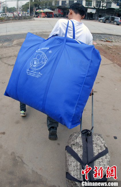 过年了,是回家团聚团圆的传统节日。湖南省安仁县外出打工的近10万农民工陆续回家过春节。走进城乡到处可见一道“包”织成的风景线:他们个个手提着包,肩挑着包,背扛着包,头顶着包,大大小小的包內,装着收获,装着喜悦,装着幸福,奔走在回家的路上。透过那形形色色的大包小包,让人看到了浓浓的亲情,深深的乡情在传统的习俗中延伸升华,别有一番风味。何炳文 摄