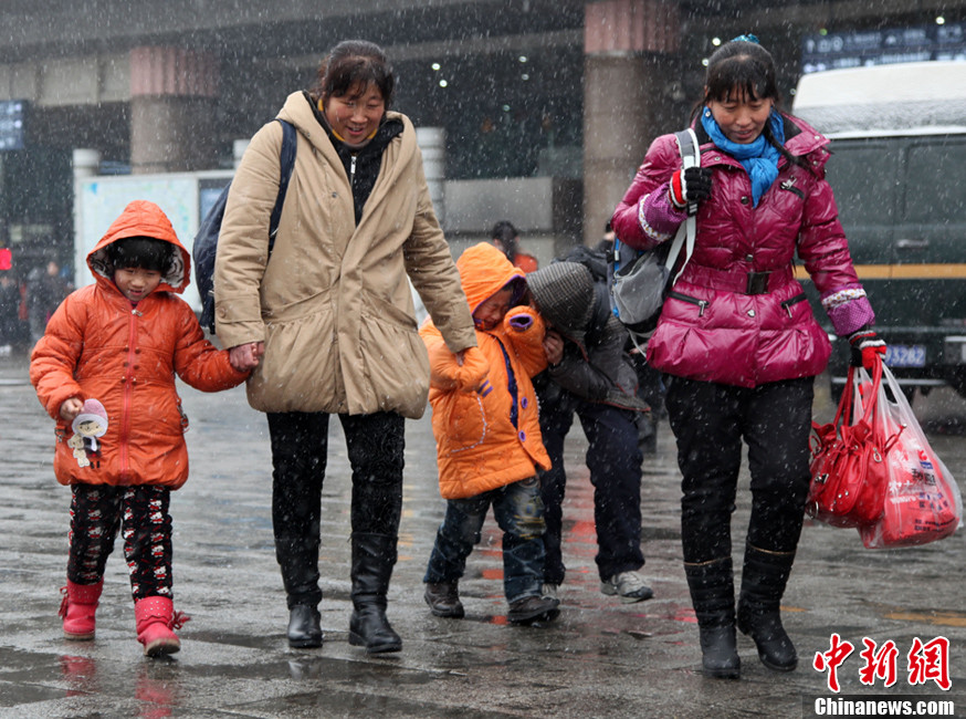 2月5日,北京在大雪中迎来春运客流高峰,旅客在北京西站冒着风雪踏上返乡的旅程。中新社发 韩海丹 摄