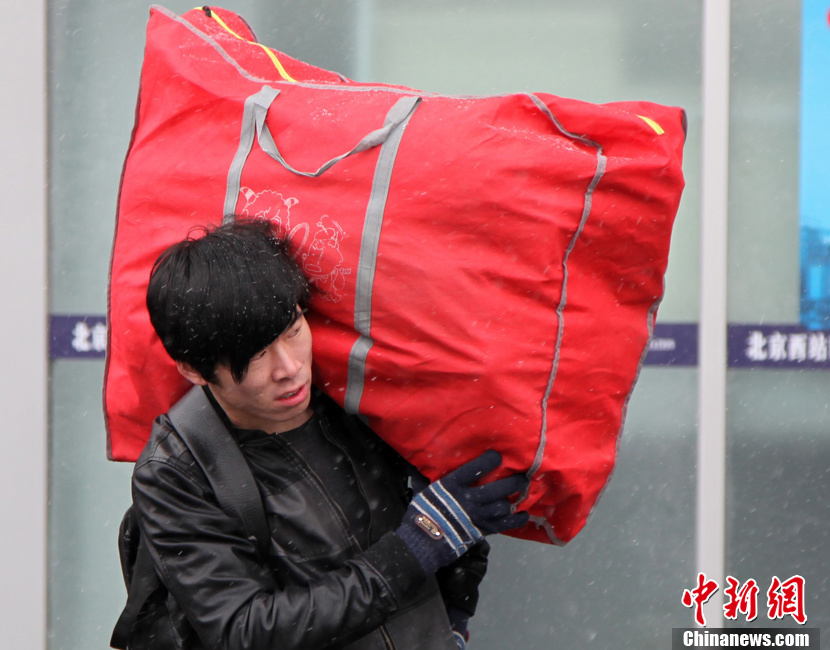 2月5日,北京在大雪中迎来春运客流高峰,旅客在北京西站冒着风雪踏上返乡的旅程。中新社发 韩海丹 摄