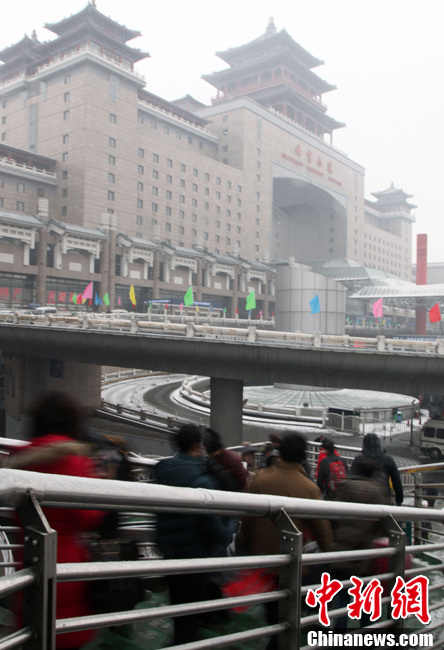 2月5日,北京在大雪中迎来春运客流高峰,旅客在北京西站冒着风雪踏上返乡的旅程。中新社发 韩海丹 摄