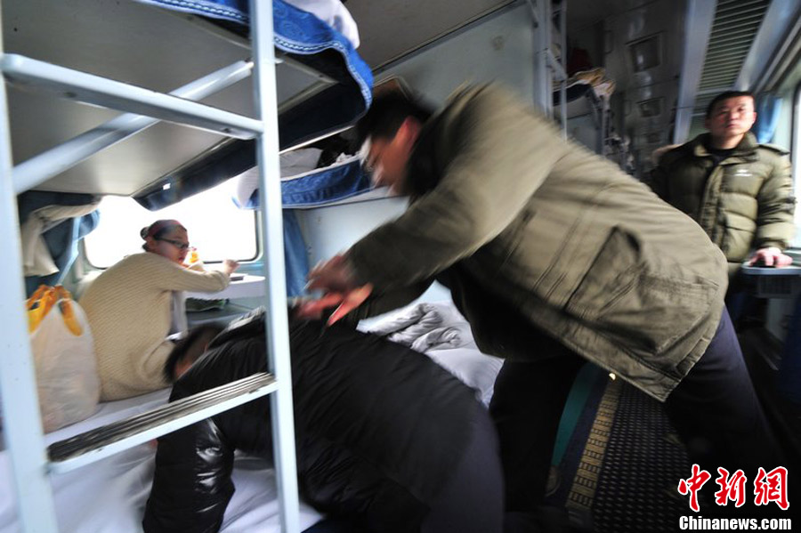 春运期间,当旅客们匆忙回家过年时,他们不会想到,在他们的中间,有一群人正在暗中保护着他们的财产安全,这就是铁路警方的反扒民警。2月3日,记者跟随一位从事反扒工作十余年的民警刘明,体验反扒民警的真实生活。图为2月3日,安徽蚌埠,一名嫌疑人被抓捕。图片来源:CFP视觉中国