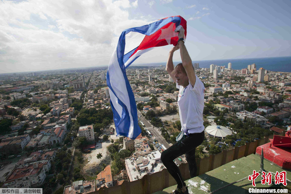 当地时间2月4日,古巴哈瓦那,法国“蜘蛛人”Alain Robert在没有安全设备的保护下,成功攀爬高度达到126米的哈瓦那利贝酒店。