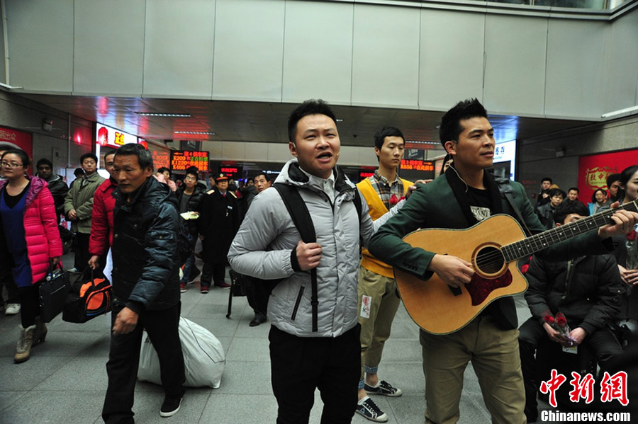 杭州美女帅哥车站文艺“快闪” 温暖回家路