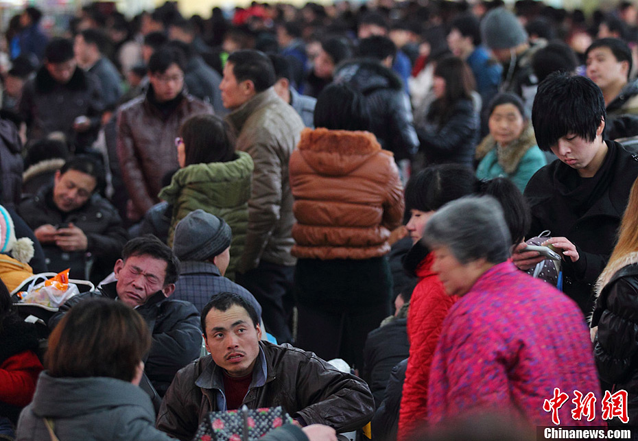 2月5日,南京中央门长途汽车站候车大厅内,大批旅客等待检票上车。随着春节即将来临,踏上返乡归途的旅客越来越多,春运迎来节前高峰。中新社发 泱波 摄