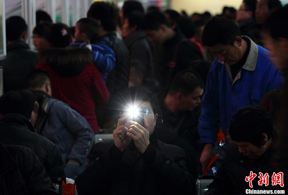 2月5日,南京中央门长途汽车站候车大厅内,一位等候检票上车的旅客用手机拍起照片,以解等车之闷。随着春节即将来临,大批旅客踏上返乡归途,春运迎来节前高峰。中新社发 泱波 摄