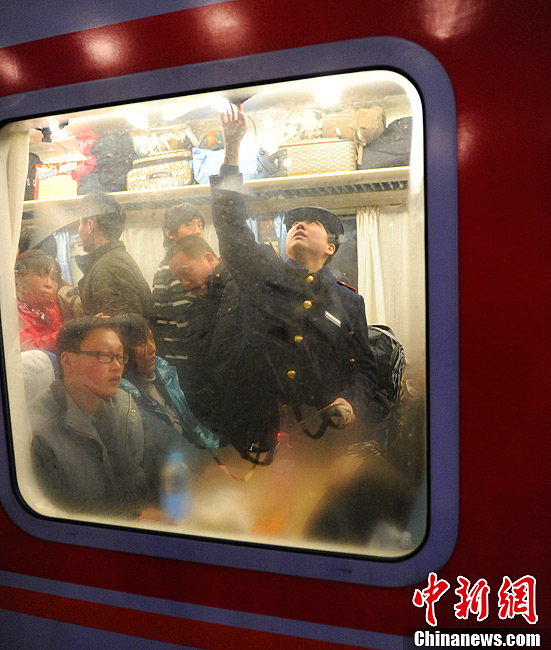 2月5日,在上海铁路局新增北京至阜阳临时L0132次客车上,车窗内演绎着各种春运表情。该趟列车实载人数为1433人,根据售票处显示目前车票全部售空,包括无座票。为增加运力,卧铺车厢也改成了硬座车厢。有2000多人乘坐这趟列车返回阜阳。中新社发 张娅子 摄