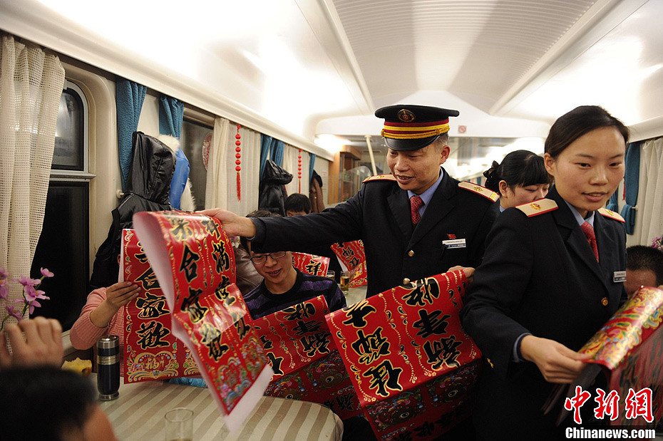 2月5日,在上海铁路局新增北京至阜阳临时L0132次客车上,上海铁路局合肥客运段亳温支队列车长李宾与乘务员为了让家乡的父老乡亲一上车就能感受到乡情的温暖,一起在各节车厢里贴起春联,挂起红灯,并为乘客发放新春纪念品。该趟列车实载人数为1433人,根据售票处显示目前车票全部售空,包括无座票。为增加运力,卧铺车厢也改成了硬座车厢。有2000多人乘坐这趟列车返回阜阳。中新社发 张娅子 摄